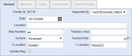 • Update Map: This field can be used as a flag for whatever purpose your organization wishes. For example, it could be used for instances when the map or GIS need to be updated. The administrator can search for inspections that have this field selected. The name of the field can be changed by editing the corresponding XML file.