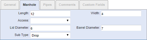 • Sub Type: Select the category of the manhole. The contents of this list are populated by the administrator in Designer under PreferencesCustom CodesSMHTYPE.