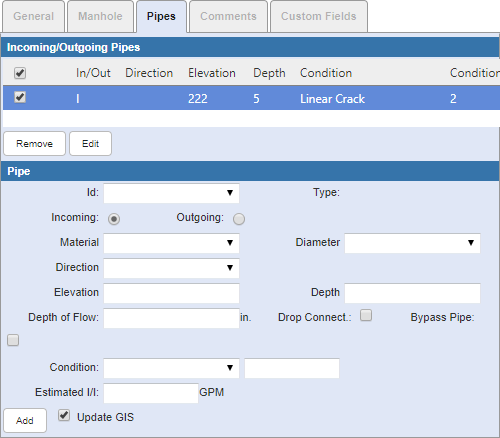 The Incoming/Outgoing Pipes section displays any pipes already associated with the manhole.